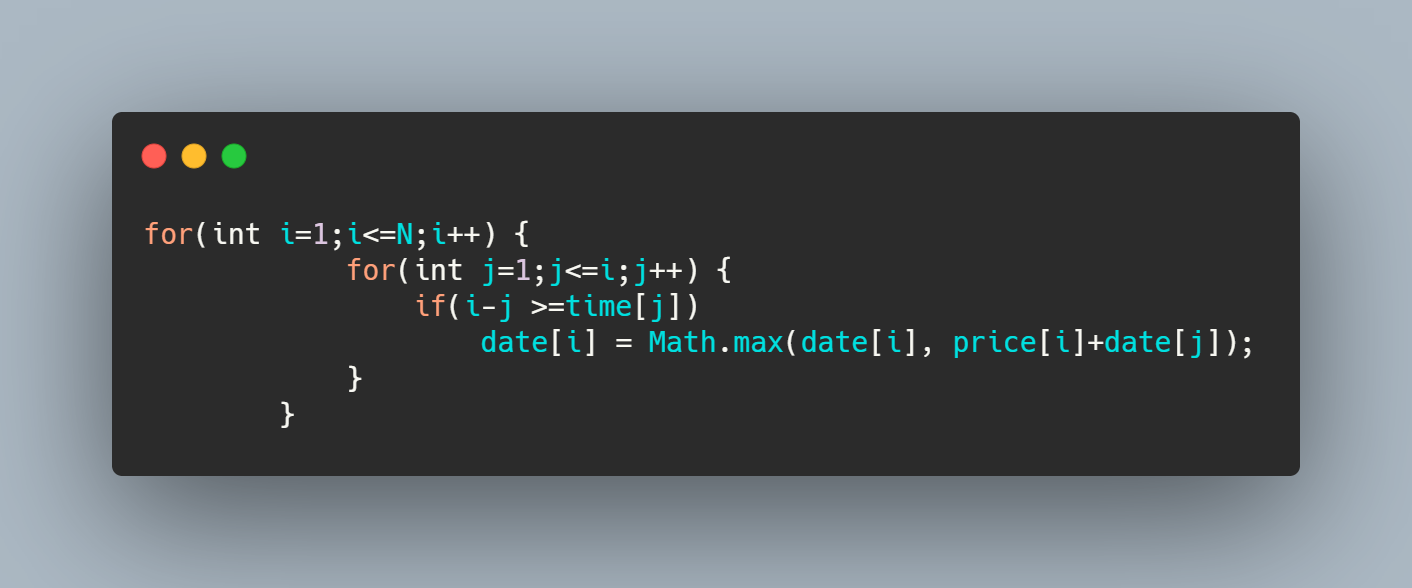 i-j>=time[j]를 통해 현재 날짜가 갈 수 있는 날짜?면 그러니까 j번째 날짜에 일을해서 현재 날짜보다 더 오래 걸리면 안되니까 이런 경우에는 date[i]에 저장되어 있는 이득과 현재날짜의 이득 price[i]와 이전 날짜의 최대 이득 data[j] 를 더한 값을 비교하여 더 큰 값을 현재 날짜에 얻을 수 있는 최대이득 배열에 넣어준다.